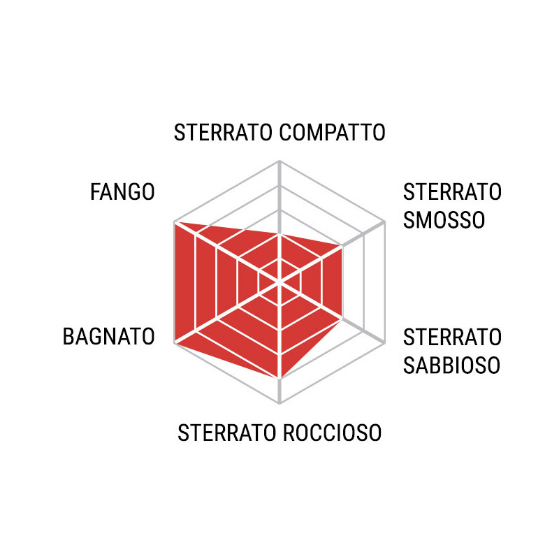 - Tasselli centrali a basso profilo per “aggredire” il terreno: ulteriore trazione quando la ruota è “piena” di fango